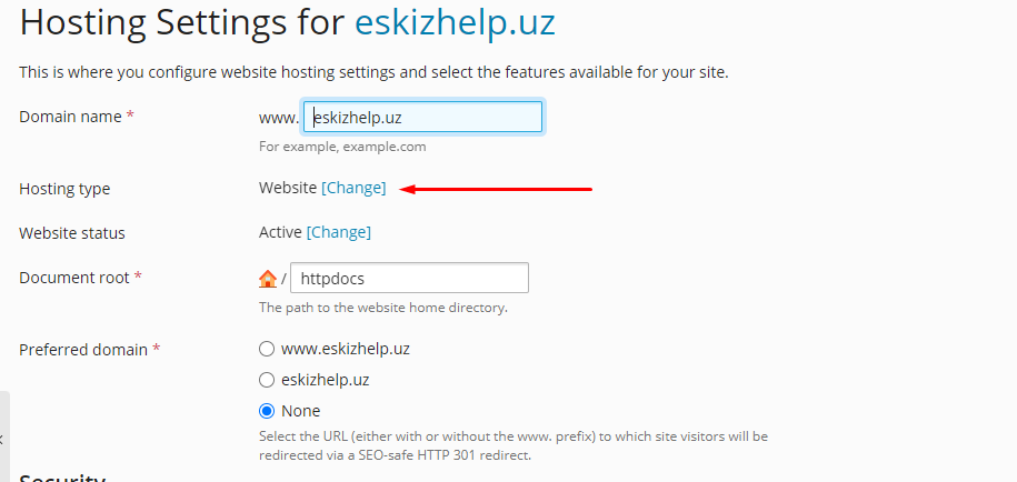Далее в настройках хостинга вибираем тип хостинга