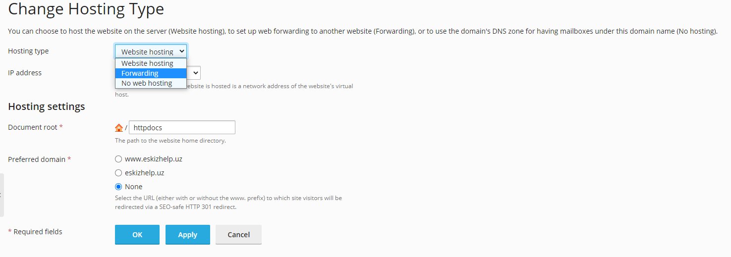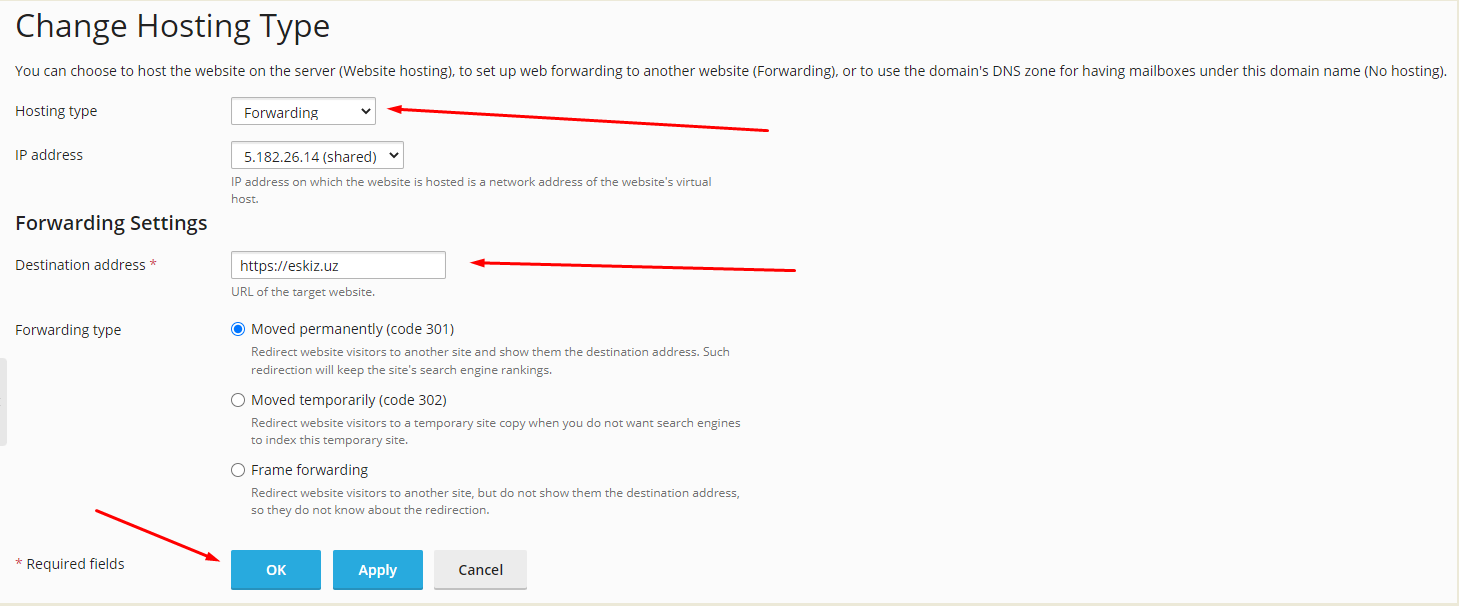 Далее в настройках типа хостинга выбираем "Перенаправление"