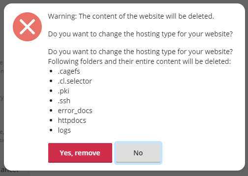 Далее выходит сообщение с уводемлением о том что все папки относящийся к домену текущему будут удалены
