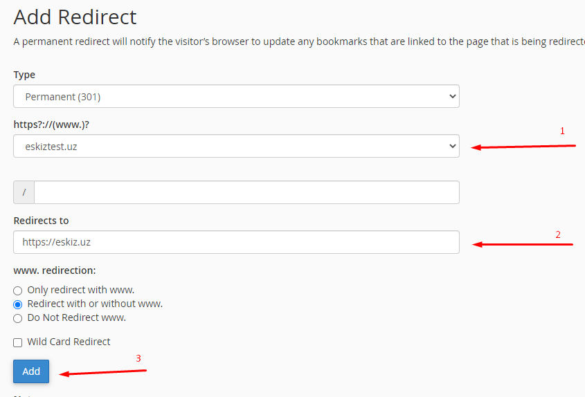В открывшемся окне Добавить перенаправление указав Тип, выбрав домен или под домен который хотите переадресовать. В поле Перенаправление укажите домен на который переадресовываете и нажмите Добавить
