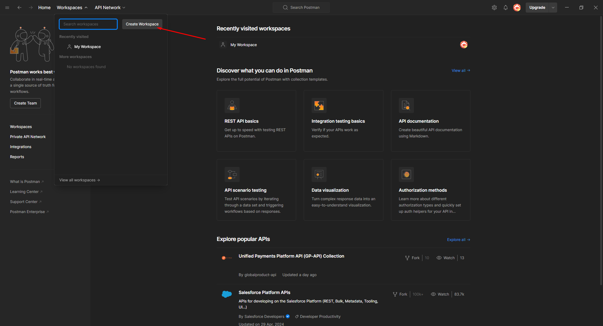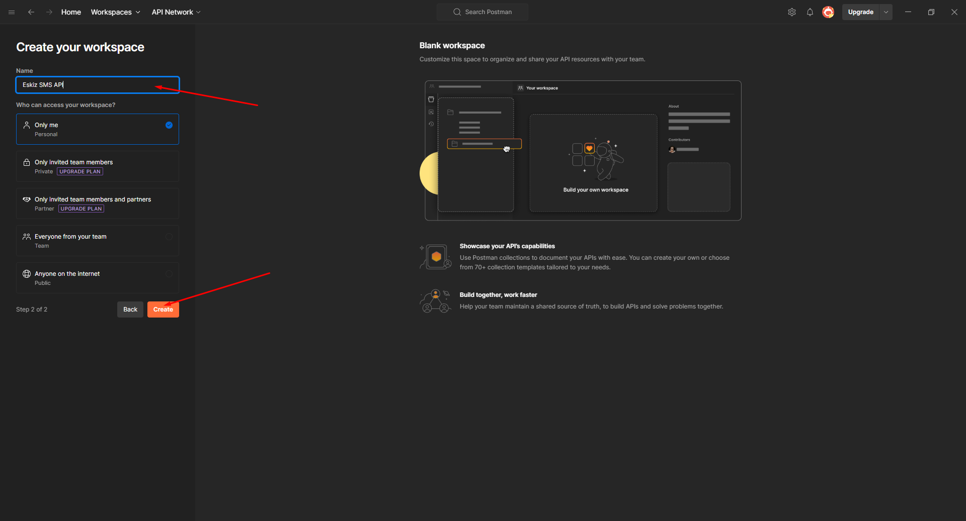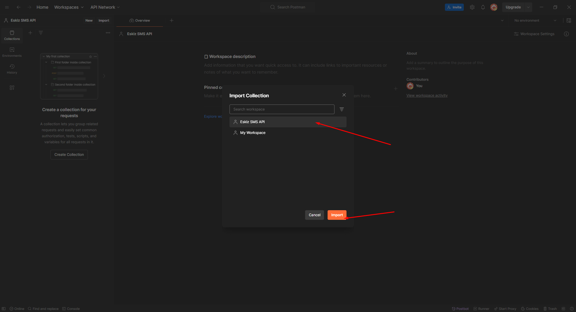 -Создать Workspace под названием Eskiz SMS API (по желанию)
