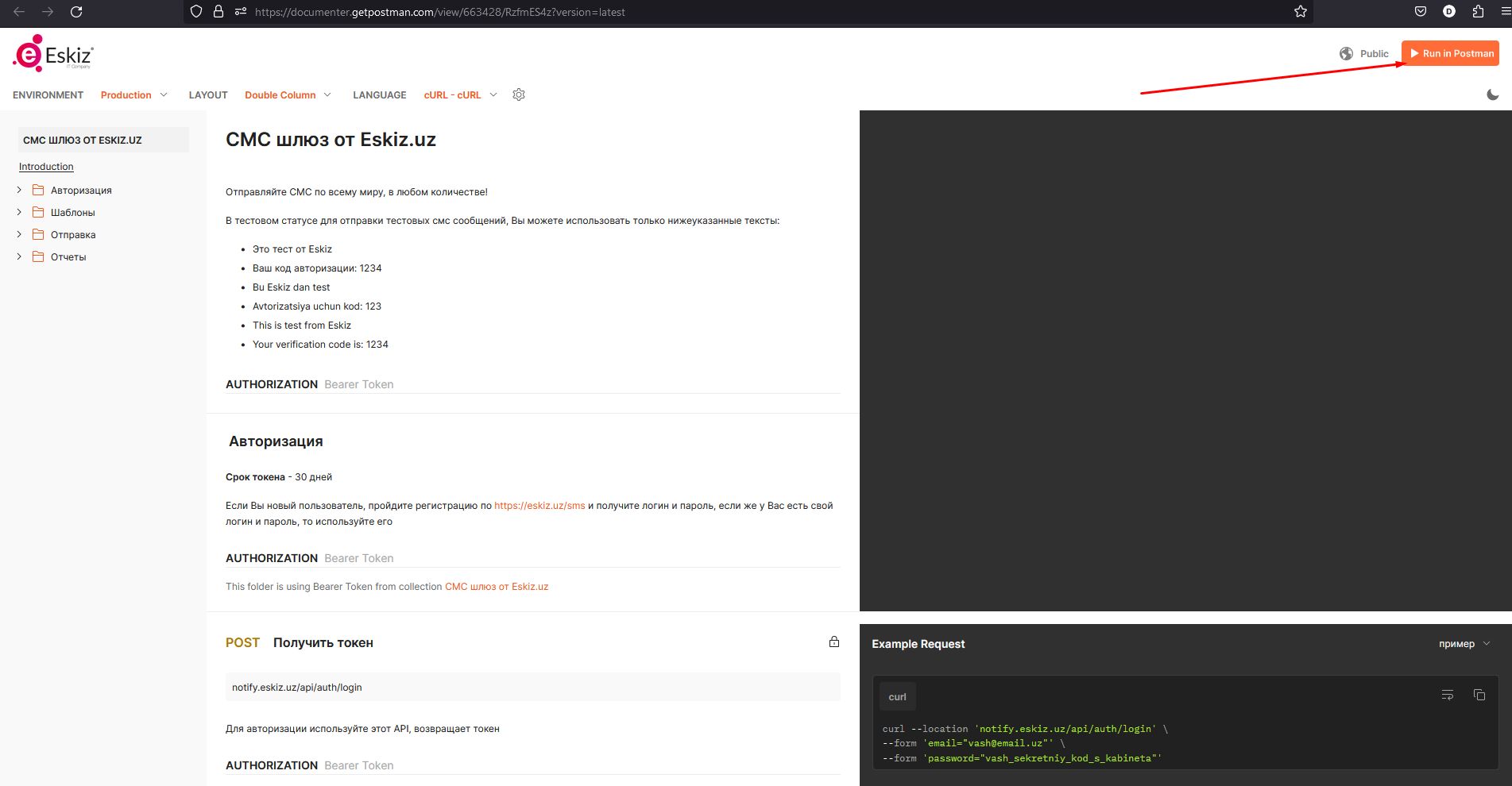 3. Перейти к документации API SMS Eskiz, нажать на Run in Postman