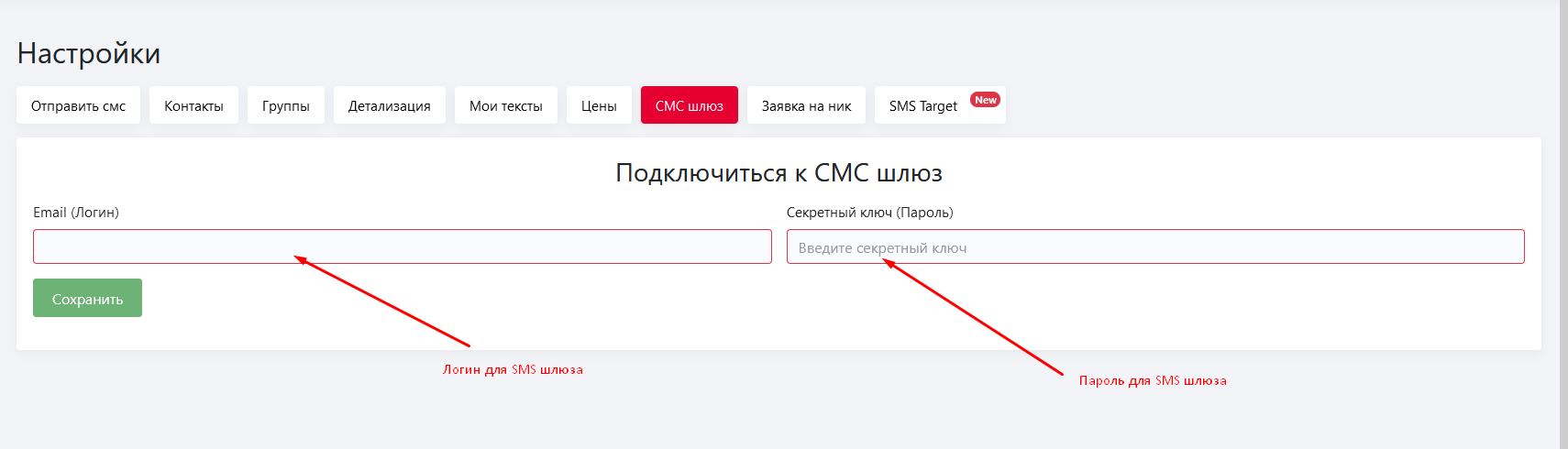 2. Получить логин или пароль SMS шлюза