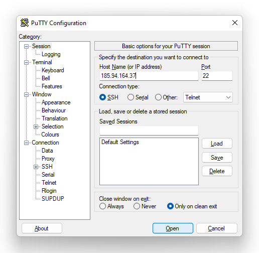 Запустите PuTTY и появится окно, т.е. сама программа. Это выглядит как на скриншоте ниже.